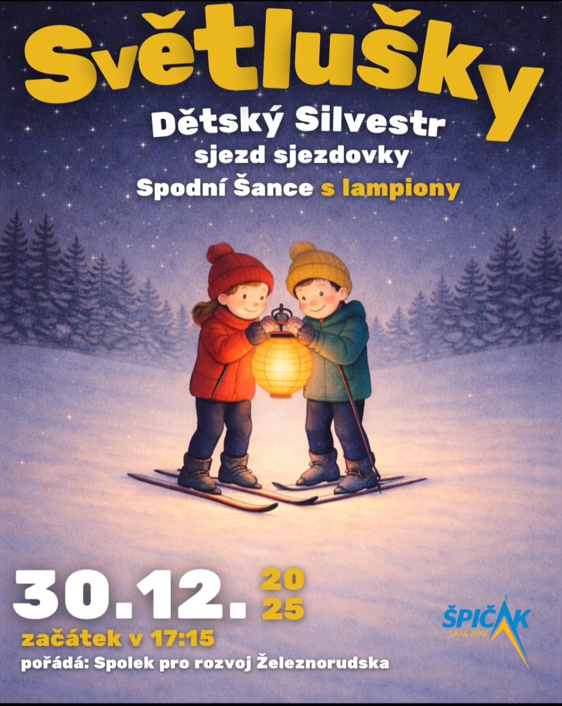 Zveme vás na dvě večerní akce, při kterých se rozloučíme s letošním rokem. V úterý 30. prosince se uskuteční Světlušky – dětský „Silvestr“ s lampionovým průvodem na lyžích a následným večerním lyžováním. Na Silvestra pak naváže tradiční Silvestrovský sjezd Šancí, kdy členové Horské služby Šumava sjedou nejprudší špičáckou sjezdovku s pochodněmi. Součástí programu bude občerstvení, oheň a ohňostroj.